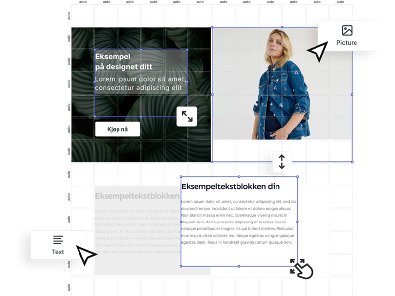 Du kan også gjøre elementene større eller mindre og endre plasseringen ved å klikke og dra. Tekster kan du skrive direkte på bilder, bannere eller tekstblokker.