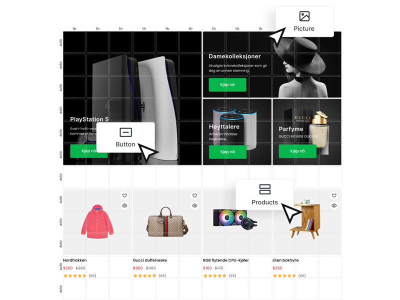 DigiTiles deler forsiden i nettbutikken inn i et dynamisk rutenett. I admin-panelet kan du dra og slippe ulike innholdstyper til ønsket rute. Flytt inn videoer, Google Maps, bilder, bannere, tekstblokker, produkter og mer, akkurat der du vil ha dem. Med enkel dra-og-slipp-funksjonalitet styrer du utseendet på siden med full kontroll og fleksibilitet. Bygg en side som ser ut akkurat slik du ønsker – raskt og enkelt!