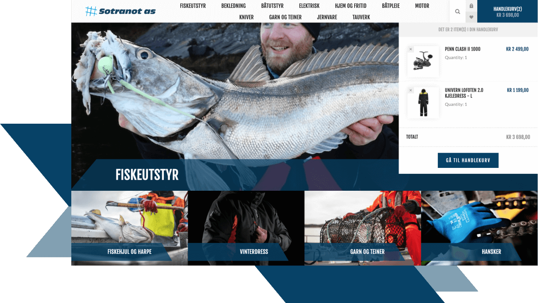 Sotranot leverer yrkesklær, verneutstyr og maritimt/industrielt forbruksmateriell til profesjonelle kunder. Løsningen er en innlogget nettbutikk der hver kunde automatisk ser sine egne priser, rabatter og sortiment – styrt av integrasjonen mot Visma.net. Med AI-støttede søk/anbefalinger og PunchOut for større innkjøpere får kundene en rask, presis og forutsigbar bestillingsopplevelse, mens Sotranot får færre manuelle henvendelser og bedre kontroll på ordre, pris og lager.